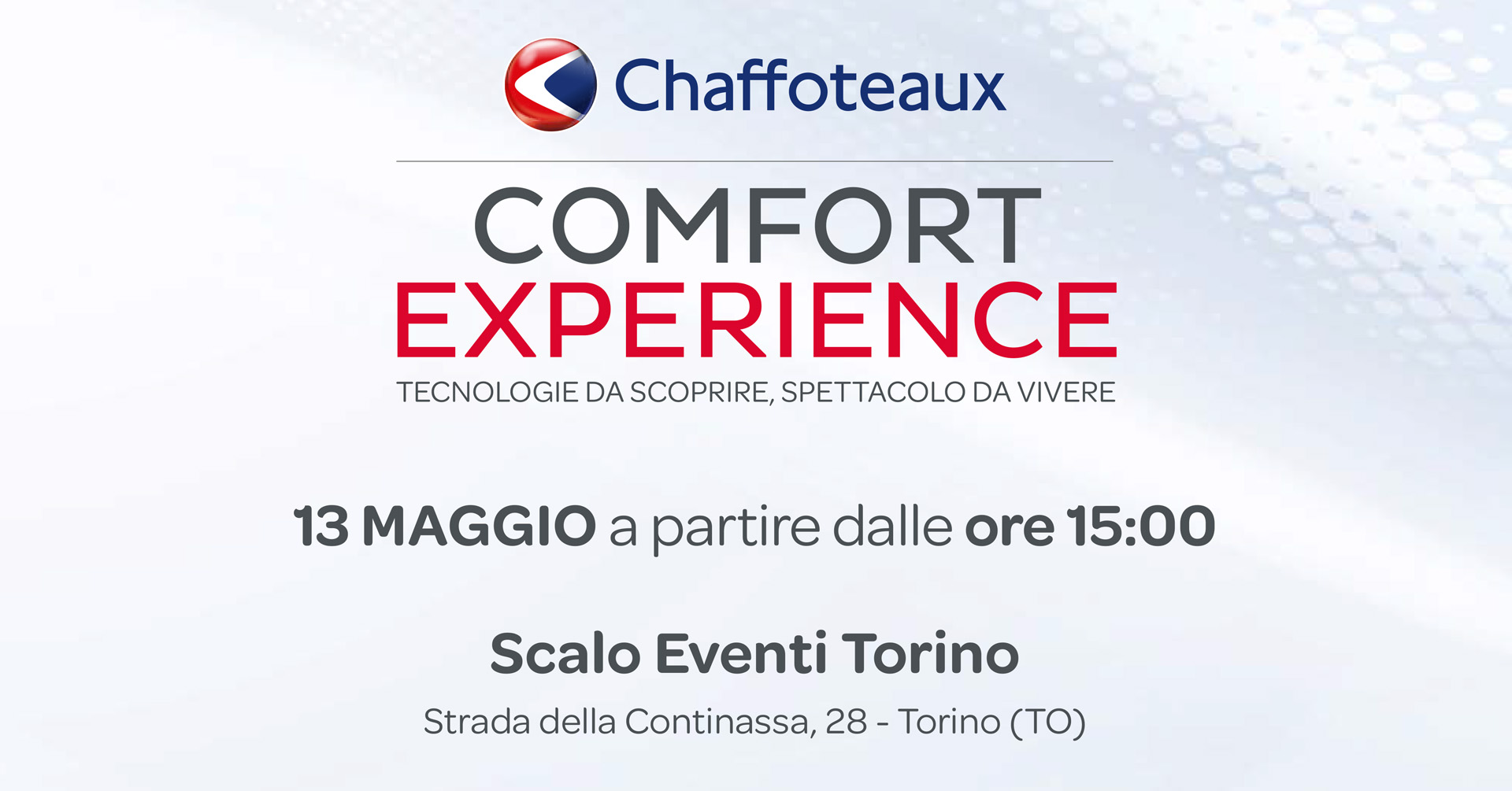 COMFORT EXPERIENCE ARISTON Depaoli insieme per la tappa piemontese, ti aspettiamo il 13 maggio 2026 nel particolare Scalo Eventi Torino, strada della Continassa 28 a Torino, dalle ore 15.00.
